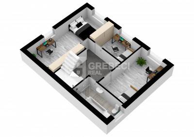 * poschodie tvoria tri nepriechodné spálne a priestranná kúpeľňa so sprchovým kútom, vaňou, umývadlom, práčkou a WC.