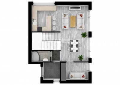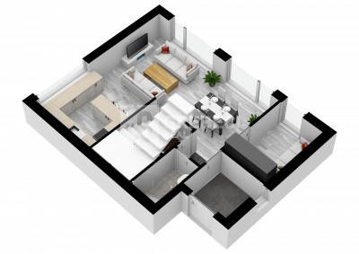 * na prízemí vás privíta vstupná chodba s priestorom na vstavaný šatník, kúpeľňa so sprchou a umývadlom, samostatné WC, hosťovská izba, priestranná kuchyňa, jedáleň a obývacia izba s francúzskymi oknami a východom na terasu a záhradu